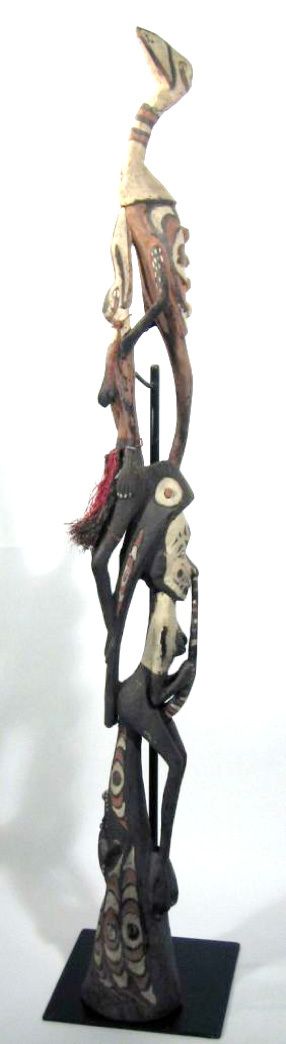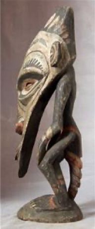 アベラム族は、ニューギニアセピック川中流域北側の低丘陵地帯と平地に、小さな集落を構成して暮らしている農耕民族で、アベラム語を話します。根菜類を栽培し、ブタを飼育しており、主食はヤムイモです。1978年当時人口は、4000人から5000人で、人口密度は 1km2辺り 77人だったそうです。儀礼は、先程説明したヤムイモ信仰が中心で、その他に男子の成人儀礼が有り、男達だけが入れる宗教儀礼の建物(タンベラン)が村に建てられています。
